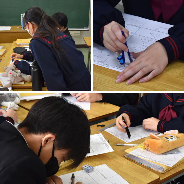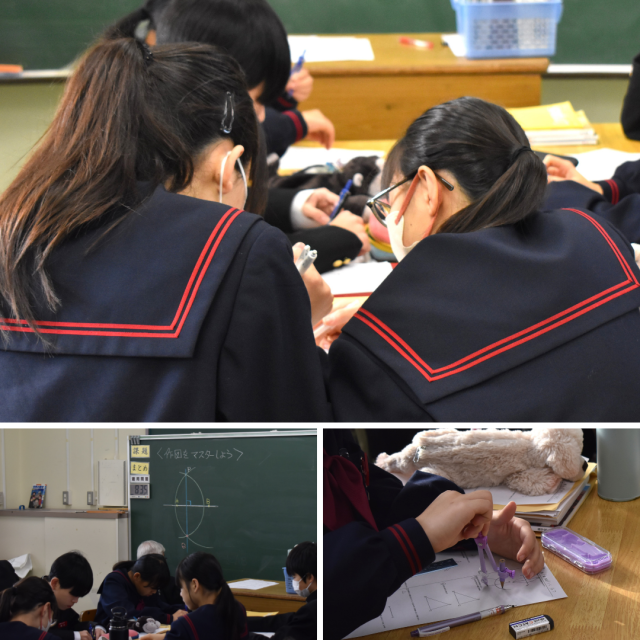 1年生数学科の授業。今日は作図に取り組んでいました。定規とコンパス、たった2つの道具を使って、どんな図形も描けるところが作図の面白いところですね。演習問題と向かい合ったときに、どの作図の方法を利用したらよいのかを判断できるようになるためには、垂直二等分線、垂線、角の二等分線、作図の基本となる3つの方法をしっかりとマスターすることが大切ですね。個人で作図に取り組みながらも、すこしつまずいたら、モニターを参考にしたり周りの仲間にアドバイスをもらったりして、作図の基本定着を図っていました。