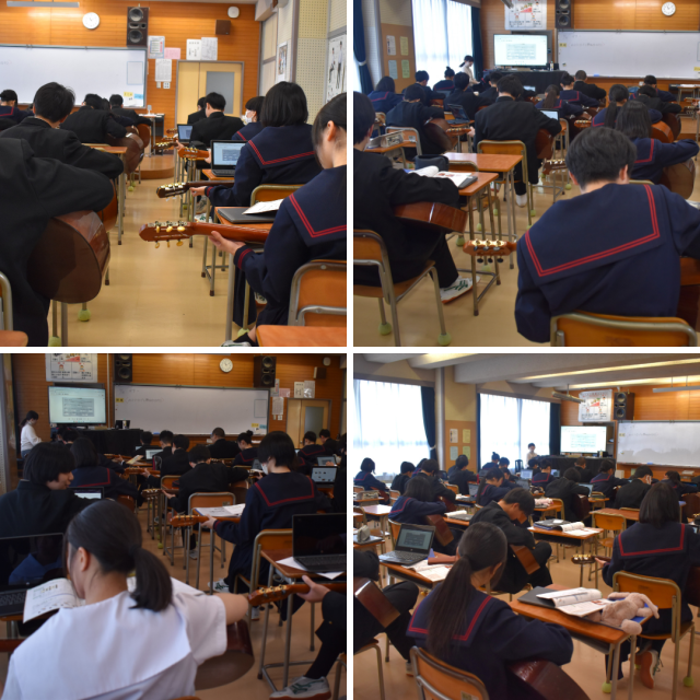 2年生音楽科の授業。現在、ギターに取組中です。音楽室前を通ると、ちょうどカントリーロードの演奏が聞こえてきました。皆さん、あっという間に上達しますね。