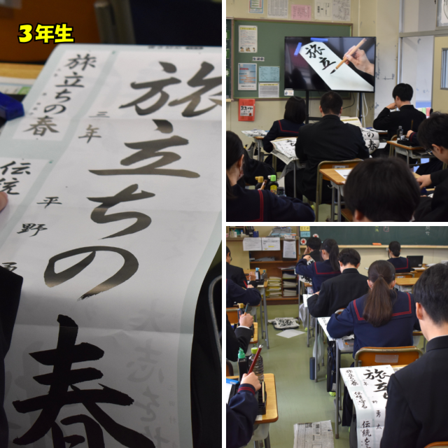 書き初めー「不言実行」「新たな目標」「旅立ちの春」