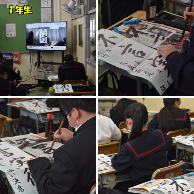 現在、国語科の授業では書き初めの練習に取り組んでいます。1年生は「不言実行」、2年生は「新たな目標」、3年生は「旅立ちの春」。毎年恒例の冬休みの課題ですね。年明け、各教室に飾られるそれぞれの書き初めを楽しみにしています。
