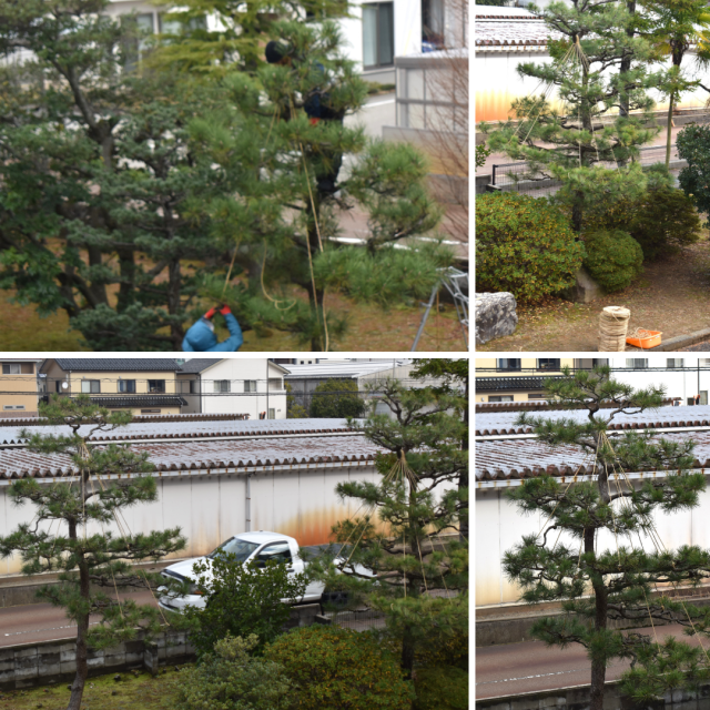 今日は、鳴和中においても、雪つリの作業が行われていました。作業いただいた造園業者の皆様、ありがとうございました。