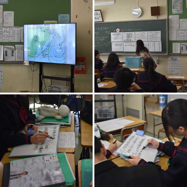 2年生理科の授業。今日は、目指せ気象予報士を合い言葉に、12月21日から23日の天気図から読み取れることについて、グループで話し合っていました。自分の考えを恥ずかしがらずに伝える、そして周りがそれをしっかりと受け止める、そして互いの考えを深めていく、これからも大切にしていってください。