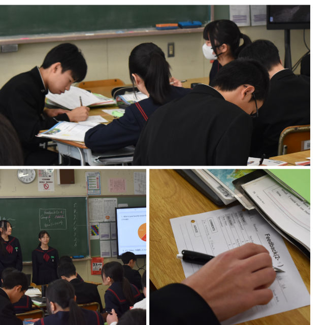 2年生英語科の授業。現在学習しているUnitでは、「身近なトピックを通して、調査や発表の効果的なやり方について考え、調査した身近なトピックについて、特徴を比較しながら説明することができる」ことをゴールとしています。今日はゴールアクティビティとして、各グループの調査結果の発表を行っていました。発表者は少し緊張した様子ながらも、モニターのグラフを指さしたりしながら、相手意識をもって発表していました。内容面においても、結果の特徴を比較表現などを用いて適切に伝えていました。各グループの発表後は、フィードバックシートに評価(内容面と態度面)コメント、アドバイスを記載しました。フィードバックシートも生かしながら、これからもよりよいプレゼンができるようブラッシュアップしていってくださいね。