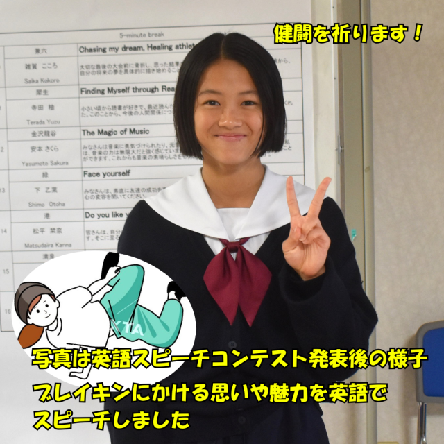 本校3年の高橋凪さんが、14日(水)からオーストラリア・ブリスベンで開催されるブレイキンの国際大会に出場します。彼女は、公益社団法人日本ダンススポーツ連盟の2025年度強化指定選手として、国内外のダンススポーツ競技会において優れた活動を続けています。昨年は、8月28日からポルトガルで開催された「ユースブレイキン世界選手権大会」に出場し、トップ8入りを果たしました。