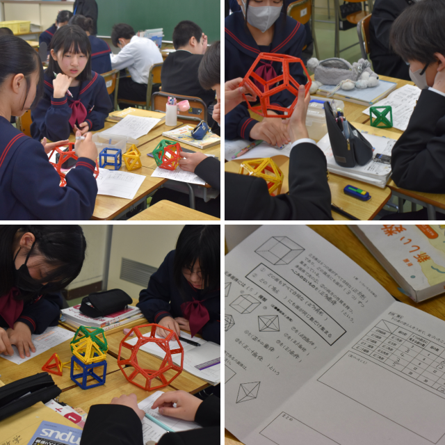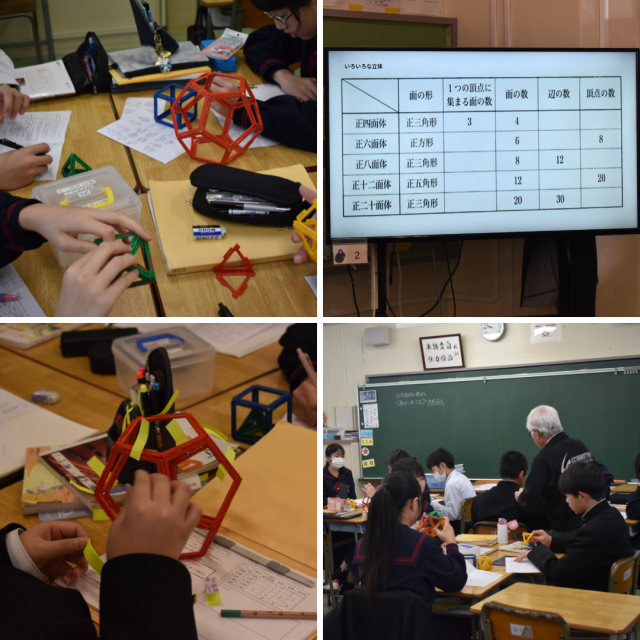 1年生数学科の授業。いろいろな立体について学習中のようです。今日は、「正多面体」の条件と種類を確認して、実際の模型を使って、正四、正六、正八、正十二、正二十面体の面の形、1つの頂点に集まる面の数、面の数、辺の数、頂点の数を調べ、気づきを共有していました。どんな気づきがあったのでしょうか。