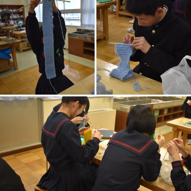 2年生家庭科の授業で進められているマフラー制作。生徒の皆さんの編みさばきも、いまや堂に入ったもので、マフラーもかなりの長さになってきました。完成も近いかな?