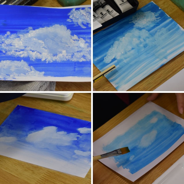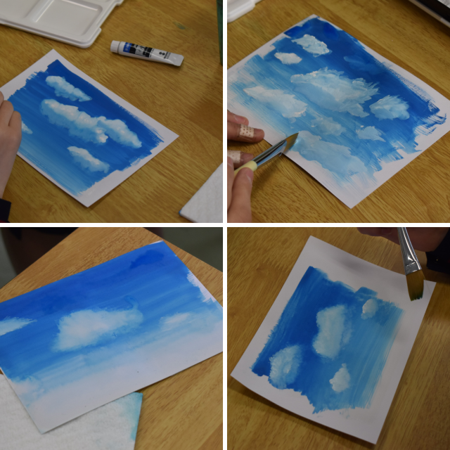 1年生美術科の授業。現在、絵の具を用いてのグラデーションに取り組んでいるようです。今日の課題は「雲を描く」。筆を立てて、紙面上をやさしく筆を動かしながら、それぞれの素敵な空の風景が仕上がっていきました。