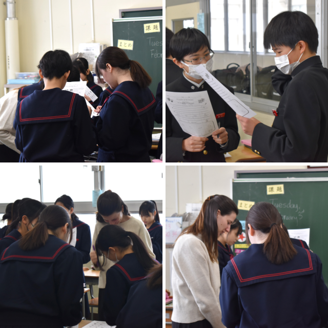 誰とでも、笑顔でコミュニケーション! 公開日 2026/02/03 更新日 2026/02/03 学校の様子 2月3日(火)1年生英語科の授業。毎週火曜と木曜は、ALTのサラ先生の来校日。サラ先生と一緒の授業は、いつもみんな楽しみながら英語に慣れ親しんでいます。今日は、Are you going to ~ の表現を用いて、クラスメイトとどんどんやりとりしていました。誰とでも、笑顔で、コミュニケーション。笑顔の輪が広がっていきました。