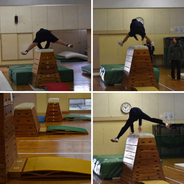踏み切りのポイント①_で踏み切る、②_を伸ばす、③_を高く維持する、それと跳び箱の奥に着手することを意識して、何度も跳び箱に向かっていました。