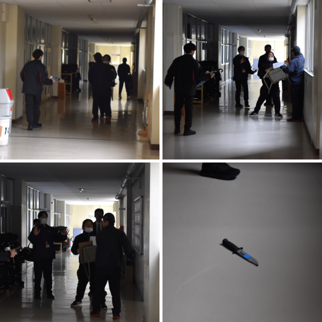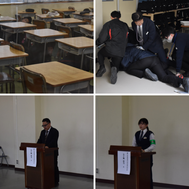本日5限目の時間帯に、不審者が校内に侵入したとの想定で避難訓練を実施しました。第1発見者の職員が刃物を持った不審者を発見、周囲に聞こえる声で対応し、様子に気付いた他の職員が職員室に報告、応援職員が現場に駆けつけ複数で対応しました。並行して警察に通報、校内放送により生徒に不審者侵入を周知、生徒は教室を施錠、静かに机の下に身を隠しました。