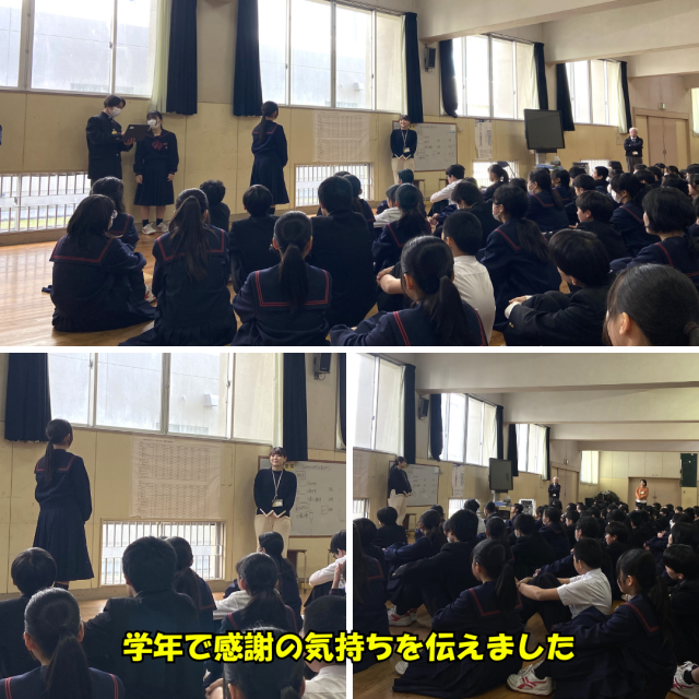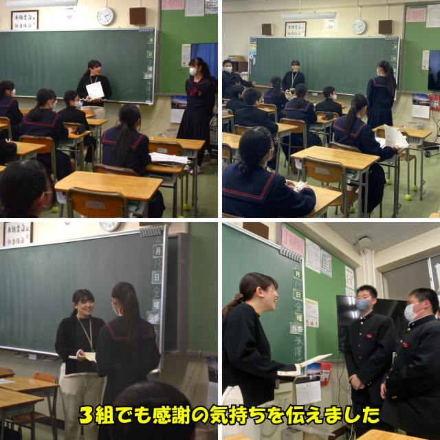 本日をもって、音楽科の西川先生がしばらくお休みに入ります。全クラスの音楽の授業はもちろんのこと、1年3組担任、吹奏楽部顧問、教育相談担当として、たくさん力を貸していただきました。最終日となった今日、1年生全員そして3組のみんなで、今までの感謝の気持ちを届けました。新たな命が無事に誕生することを、生徒、教職員一同、心より祈っています。西川先生、今まで本当にありがとうございました。落ち着いたら、また学校に顔を出してください。