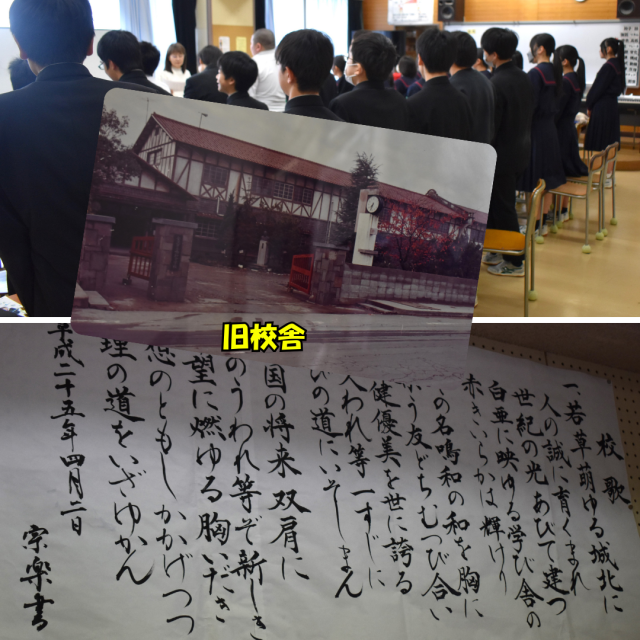 授業にお邪魔したときは、校歌の歌詞の意味を再確認していました。全校生徒、教職員で歌う最後の校歌は卒業式。3年生は学び舎への3年間の感謝の気持ちを込めて、そして在校生は3年生への感謝の気持ちを込めて、それぞれが歌詞の意味を噛みしめながら、体育館に歌声を響かせて欲しいと思います。