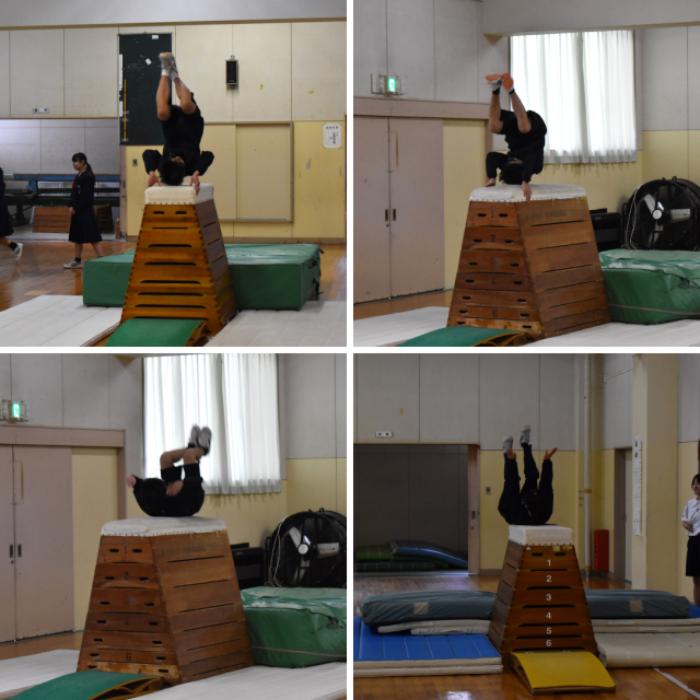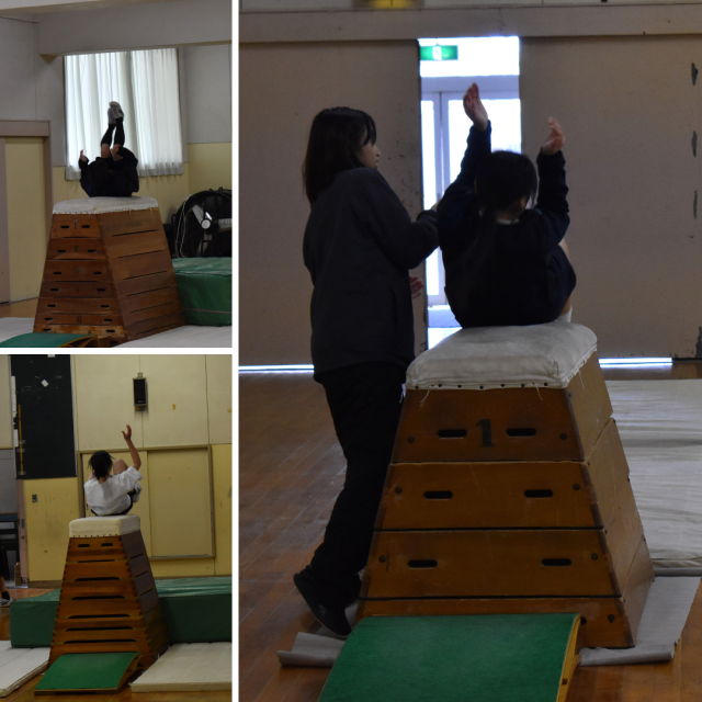 2年生、今日は台上前転の習得に励んでいました。各自の現段階のレベルに合わせて、高さを選択し、何度もより美しく台上前転ができるよう、互いにアドバイスを送りあいながら、チャレンジしていました。