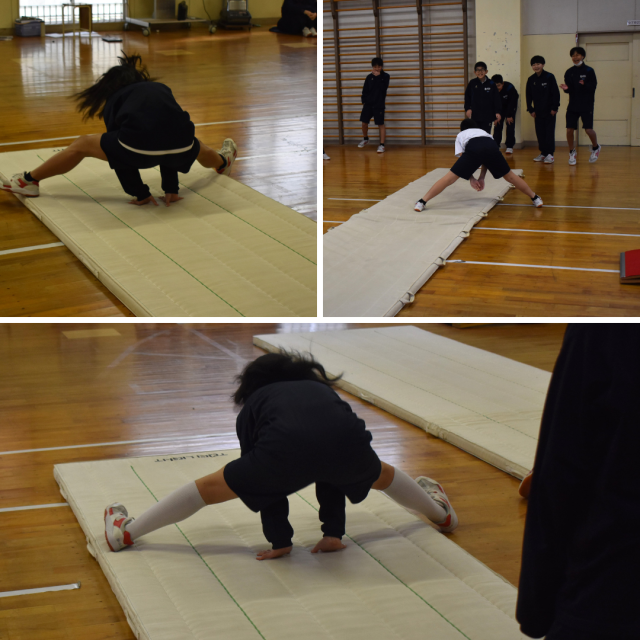 1年生、今日は開脚前転・開脚後転に習得に励んでいました。前転・後転の動きを復習後、映像で技のポイントを確認し、何度もチャレンジしていました。生徒さんの一人が、開脚前転の手本を見せると、自然と拍手が起こりました。とっても美しい開脚前転でした。
