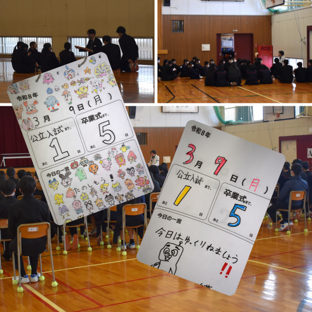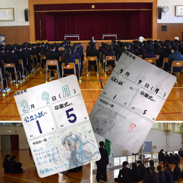 本日4限目に、3年生は最終の入試事前確認を行いました。明日からの2日間、公立入試に挑む3年生の皆さん、まずはここまでよくやってきました。あとは、今まで積み上げてきたものを精一杯発揮するのみです。試験開始の合図があったら、まずは大きく深呼吸、問題用紙を開いて各設問に目を通し、落ち着いて問題に取りかかってください。