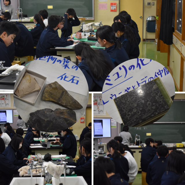 これは何の化石でしょうか?! 公開日 2026/03/10 更新日 2026/03/10 学校の様子 3月10日(火)今日は全日制公立一般入試の第1日。受検を予定していた皆さん全員が各受検校に入ったとの連絡を受け、まずは一安心しました。あとは全力を尽くすのみ。ファイト!鳴和中3年生!さて、1年生理科の授業。理科室にお邪魔すると、理科室後方の机には、なにやらたくさんの化石が・・・。皆さんは、何の化石かわかりますか?