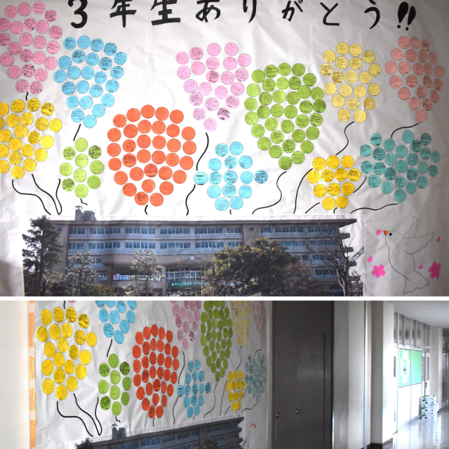3年生のフロアに、1、2年生からの3年生に向けた感謝のメッセージが掲示されています。