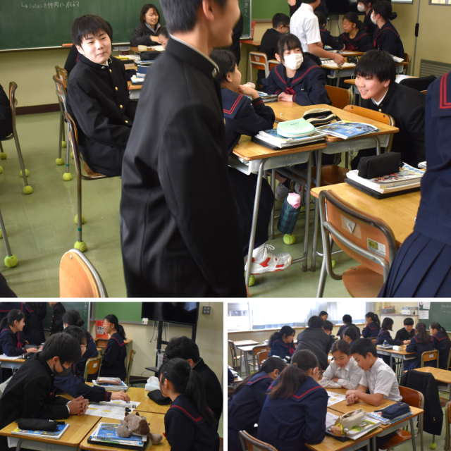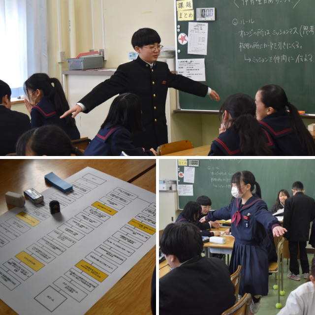 1年生保健体育科の授業。「体育理論すごろく」に興じていました。ところどころに「もも上げ10秒」「スクワット10回」「ジャンプ10回、最後にオリジナルポーズ」「片足バランス立ち10秒」などのエクササイズも盛り込まれていて、みんなとっても楽しそうでした。