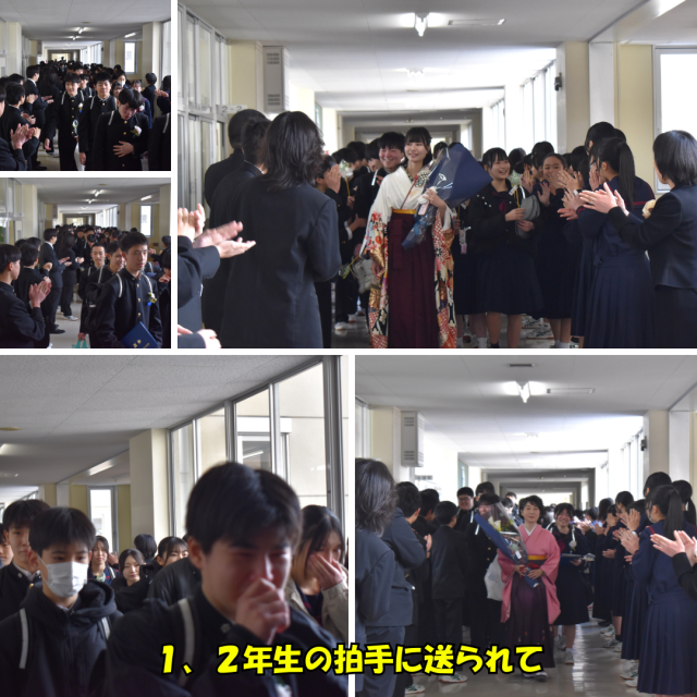1、2年生の皆さん、『式での態度』、『「さようなら」の歌声』、『送辞』、『歓送で見送る姿』、素晴らしかったです。3年生への感謝の気持ちがしっかりと伝わりました。ありがとう。前日準備、式後の後片付けもありがとう。