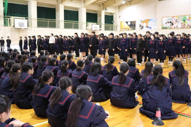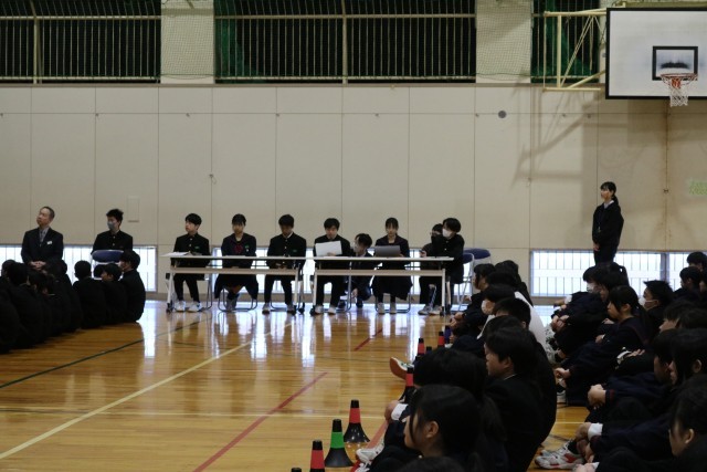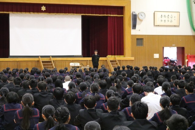 全校生徒が体育館に集まって、対面式が行われました。生徒会執行部からは、生徒会活動や学校行事についての説明がありました。また2,3年生からは校歌披露がありました。新入生は緊張した様子でしたが、しっかりと顔をあげて話を聞いていました。新入生代表挨拶では、「不安なこともあるけれど、先輩方に相談しながら、1つ1つの行事を楽しみたい」という言葉がありました。最後に生徒会会長の合図で全校生徒が「よろしくお願いします」と体育館に響く声で対面しながら挨拶をしました。とてもさわやかな対面式となりました。