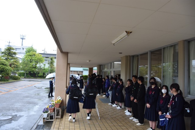 7:45から生徒玄関であいさつ運動が行われました。前期生徒会執行部役員、各学年リーダー会(学級会長・副会長)、生徒委員会委員長が参加してくれました。雨の中でしたが、大きな声で「おはようございます」と爽やかに挨拶をしてくれました。登校した生徒たちも、挨拶を返しながら、雨水が他の人にかからないように傘を閉じる様子がみられました。本校では、毎月末にあいさつ運動が行われます。次回は5月29日で、育友会の方も参加してくださいます。