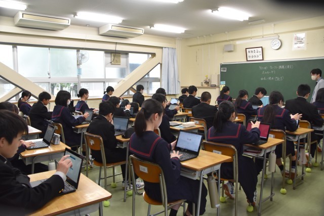 登校した後は、教室で各自が一人一台端末を使って、「ここタン」入力をしていました。「ここタン」は学校内におけるこころの健康状態の傾向把握と悩みの早期発見・対応のために取り組んでいます。