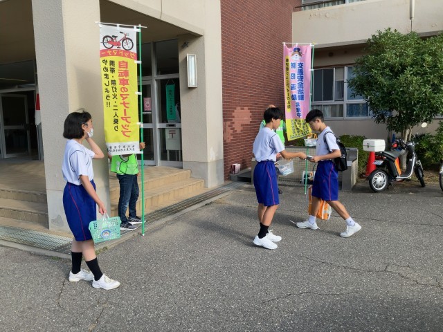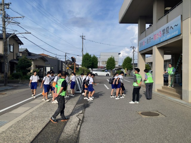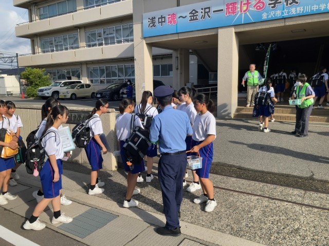 9月3日(水)朝、9月1日(月)から行われてきたグッドマナーキャンペーンの最終日です。金沢東警察署の方や地域の方々も参加して、ジュニアイーグル隊があいさつ運動とチラシを配布しました。