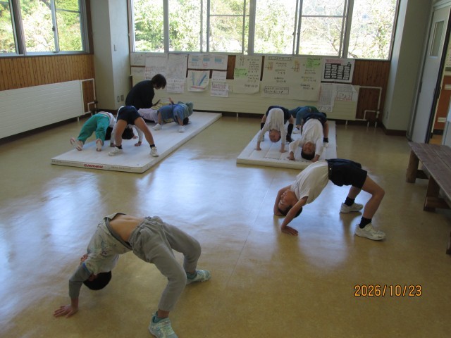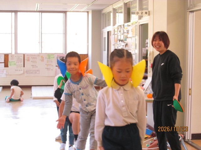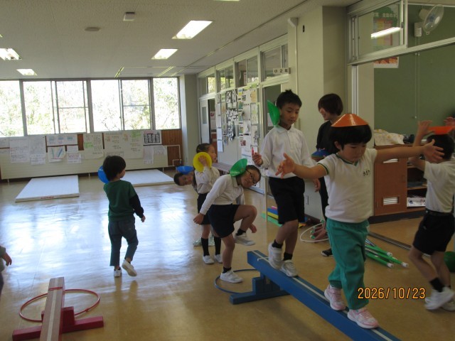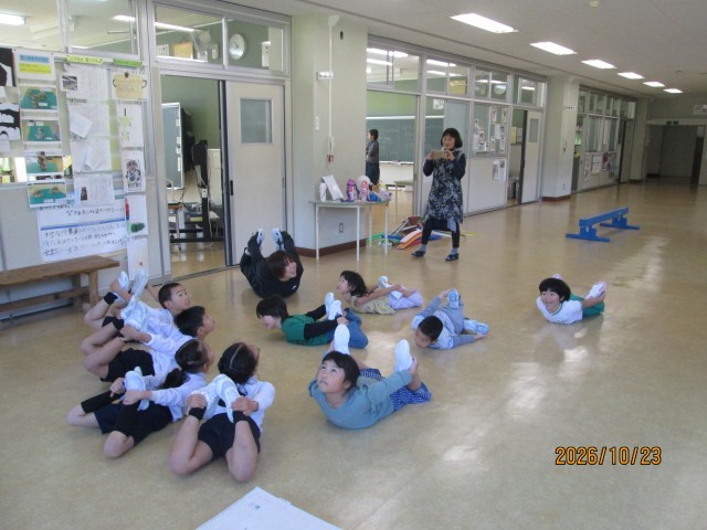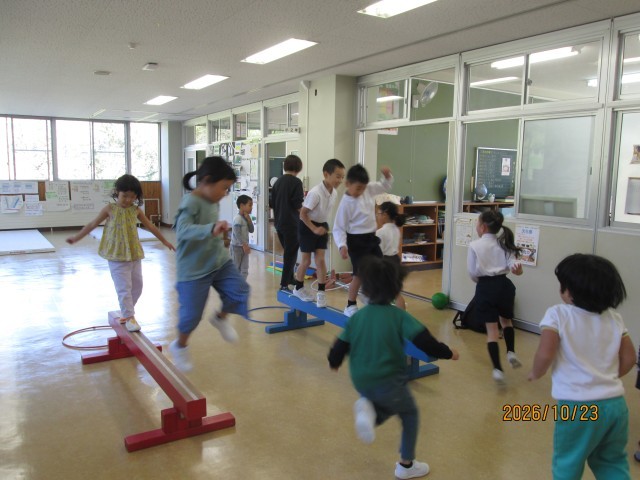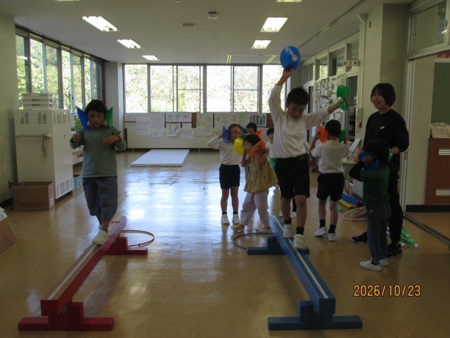 1階オープンスペースで、保育園のみんなの体育教室に小学校2年生も参加しました。