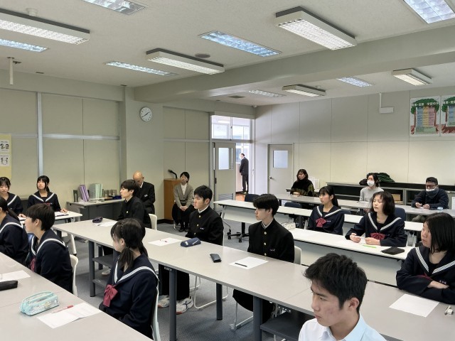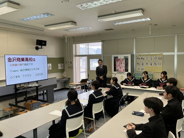 星稜高校の教頭先生と金沢商業高校の副校長先生をお招きして、それぞれの高校の特色を学ぶ授業を行いました。中学1年生から3年生と保護者の方を交えて、それぞれの高校の魅力やいまの中学生が意識すべきことについて知る良い機会となりました。