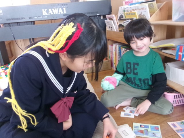 家庭科「幼児との触れ合い」という内容の一環として、湯涌保育園の園児たちとの交流が行われました。事前に園児たちが喜び、安全に楽しめるようなおもちゃを制作し、実際に遊んでみるというものでした。交流の際に、中学生は幼児と目線の高さを合わせたり、幼児が聞き取りやすいようにゆっくり話すことをこころがけたり、幼児と触れ合う時の気を付けるべきポイントをおさえながら交流していました。9月の職場体験以来の交流ということもあり、お互いに少々なじみのある、和気あいあいとした時間になったようです。