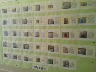 本校美術室前に、3年生の美術作品(木彫りの置き時計)の写真を掲示しました。全て実物を飾ることができないので、作品とコメントを1枚の紙にまとめ、作成した3年生全員分のものを掲示することができました。