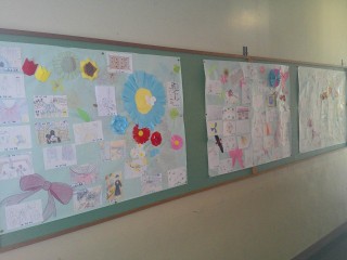 3年生教室前には、美術で作成した「思い出の絵はがき」が1年生のアイデアを生かした掲示で飾られています。絵はがきを見ると、修学旅行、部活動、朝食、勉強等いろいろな思い出が見られます。