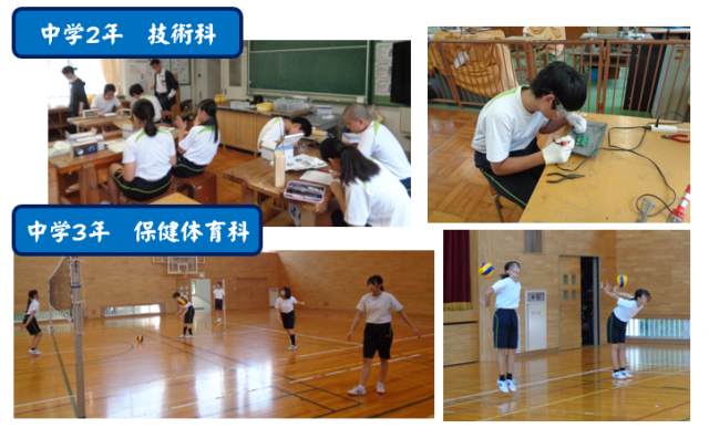 中学校の授業、技術科では、ダイナモウッディラジオが完成し、みんなで聞こえるかどうかを試して、振り返りを行っていました。保健体育科ではバレーボールの単元に入っています。先生から一人一人助言をもらいながら練習をしていました。