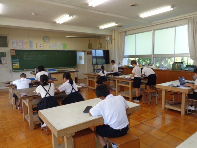 子供たちは本や端末を参考にし、先生からアドバイスをもらいながら、下書きに集中していました。