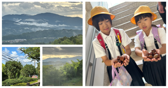 10月9日(木)秋の気配… 公開日 2025/10/09 更新日 2025/10/09 学校のようす 10月に入って、急に秋の気配を感じるようになりました。玄関のキンモクセイの香り、落ち葉、朝の霧がかかった山並み、そして栗!登校途中に拾ってきたとのこと。 今日も内川小中は、自然いっぱいです!