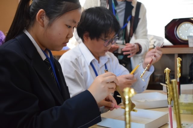 10月29日(水)に行われたフィールドワークでは、中学生が学年ごとに金沢市内を巡り、金沢の伝統文化に触れたり金沢の街づくりについて学んだりしてきました。1年生は、金箔屋さくださんで、金箔工芸品(My箸づくり)体験にチャレンジ。それぞれの模様になるようアレンジを楽しんでいました。観光物産館の砂彫りガラス体験(2年生)ではオリジナルのはんこづくり。こちらも思い思いのデザインの工夫を凝らしていました。3年生は県立図書館や近江町市場で、各自のテーマに合わせて施設や市場内をリサーチ。その場所や施設ならではの工夫を見つけて来ることができました。当日は天候にも恵まれ、校外だからこそのたくさんのよい学びがあったようです。1,2年生は、この経験を修学旅行にもつなげていけたらいいですね。