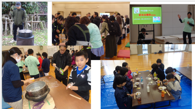 今年度は初めての試みで、リサイクル活動後にPTA主催の収穫祭を行いました。今年度取り組んでいる田んぼプロジェクトの一環です。この活動にはPTAの方以外に「内川もりあげ隊」の方も協力してくれています。リサイクル活動の最中に、ご飯を炊いてくれたり、めった汁を準備してくれたりしました。
