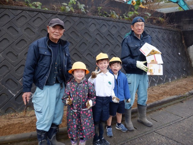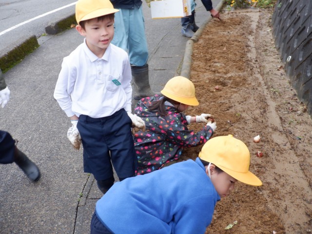 来年の春、どんなチューリップ畑になるか、とても楽しみです。校舎管理員さん2人にも手伝っていただきました。どうもありがとうございました。
