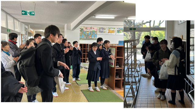 下校時、玄関では、1・2年生、進路が決まった3年生や先生方の励ましと応援を受けました。