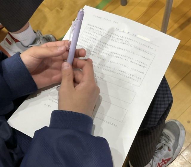事前に「いじめは、どんなことがあっていけない行為だと思いますか?」というアンケートを実施した上で、中学校1年生として、いじめという行為に対してどう向き合っていくべきか、ということを深く考察する内容となりました。