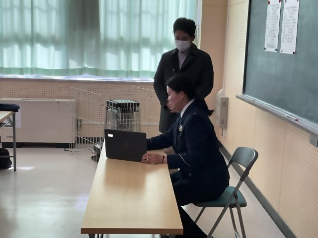 金沢中警察署から派遣いただいた警察官による迫真の演技で、緊張感を持ちながらの訓練となりましたが、その後、オンラインで各教室に配信する形で、警察官のお二人から、心がけねばならないことについての講話をいただき、教職員と生徒が一体となり、対応についての理解を深めました。