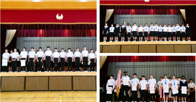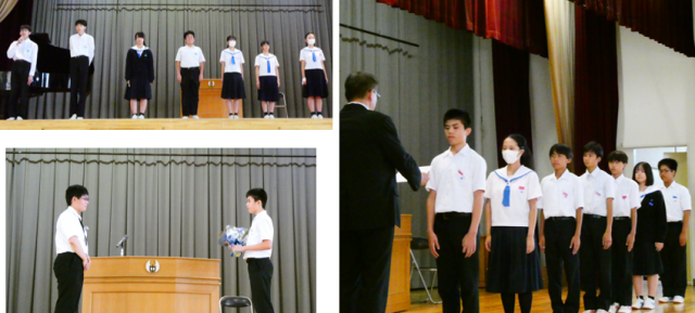 6限目に表彰披露、生徒会役員退任式・認証式、全校集会、そして離任式と、多くの大切な行事が行われました。市秋季新人大会等での入賞者を全校で称えた後、前期生徒会役員は一人ひとりが思いのこもったスピーチを行い、後期役員へは校長先生から任命書が手渡され、新たな歩みが始まりました。