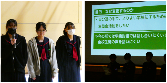 最後に、生徒会からのお知らせがあり、生徒が「より良い学校を自分たちの手でつくる主役」として、主体的に活動していくための新しい取組について紹介がありました。