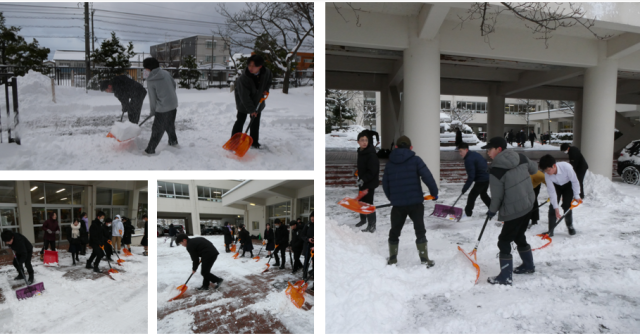 早朝のまだ暗い時間帯から先生方が校内の除雪を行い、登校時には当番の3年生が生徒玄関前の雪かきをしてくれました。冷たい雪と向き合いながらも、仲間と声を掛け合い、登校してくる生徒のことを思って丁寧に作業してくれました。