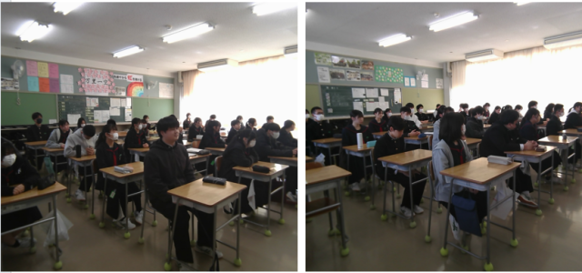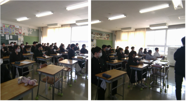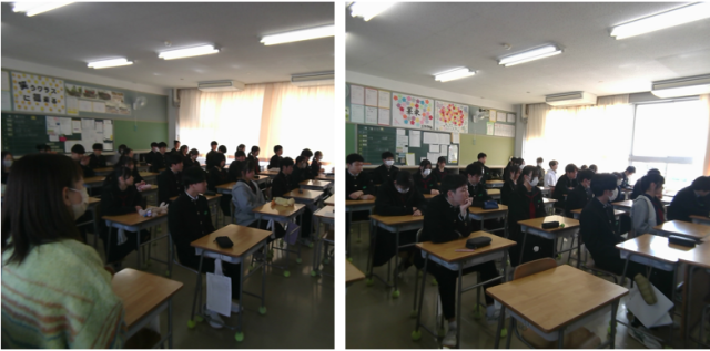 教室では、生徒たちが放送に耳を傾け、一言一言を逃すまいとするように、真剣な表情で話を聞いていました。明日を目前に控え、緊張の中にも、それぞれがこれまでの努力を思い返しているような静かな時間が流れていました。