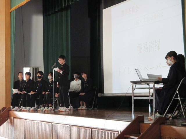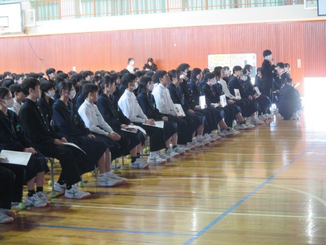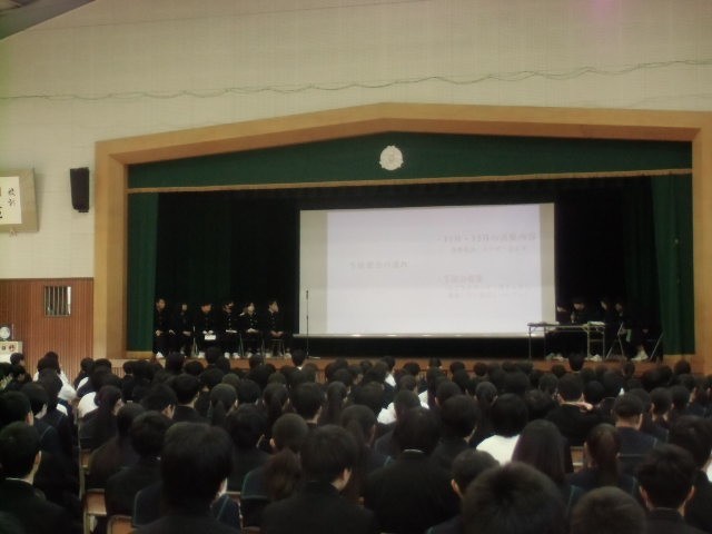 本日6限目、全校生徒が一堂に集い、生徒会執行部の運営のもと生徒総会が開催されました。各委員会リーダー会からの活動報告や活動計画を聞き、質疑応答が行われました。全校生徒が生徒会の一員であるという自覚をもち、意欲的に生徒会活動に参加するきっかけとなったことと思います。