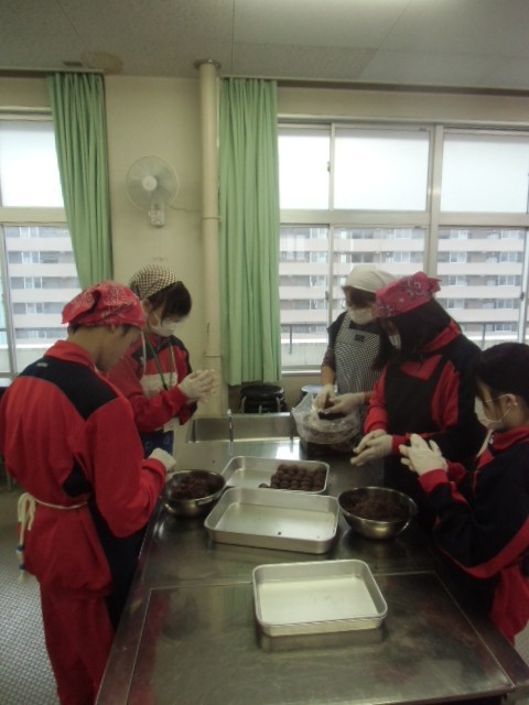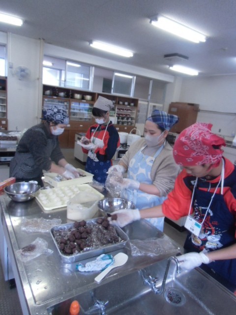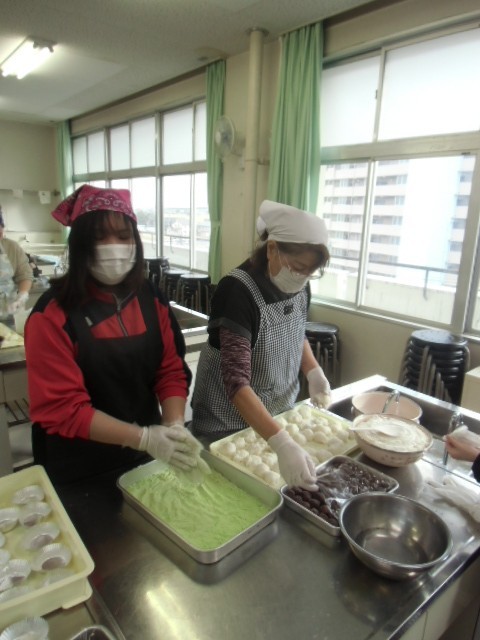 本日、地域の方のご協力のもと、若葉学級の生徒達でお萩を作りました。10月に収穫した「みどり米」を蒸し、米粒が半分残る程度に軽くつぶし丸めて作ります。丸めてからあんこやきな粉、しそやごまを付けて完成です。みんな楽しそうに取り組んでいまいした。