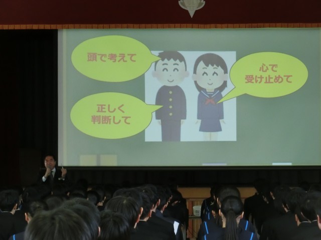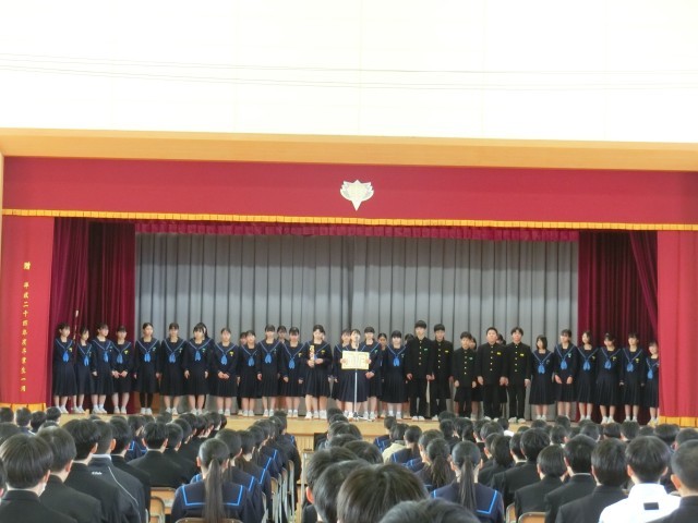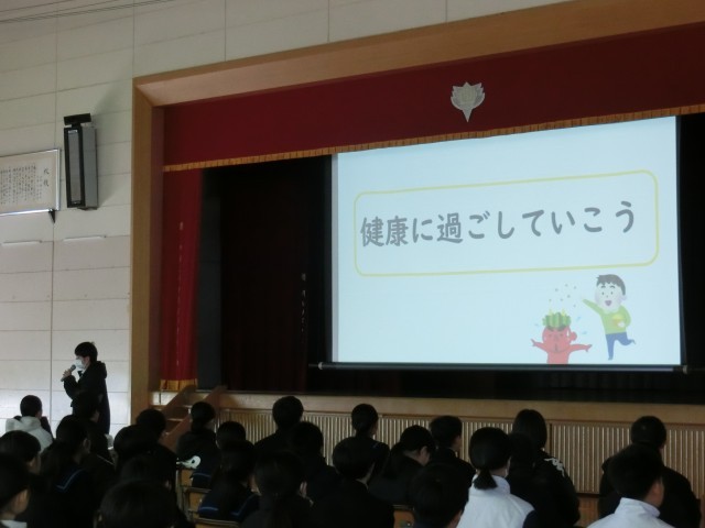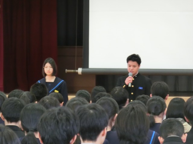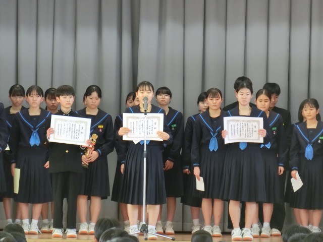 2月3日(火)、2月の月初め集会を行いました。書き初め展などの表彰披露に続き、今月は教頭先生から、学校生活の中でゆるみが出ていないか一人ひとり見つめなおし、みんなでさらによりより港中学校にしていこうとのお話がありました。また、生徒指導担当の先生から、今月の生活目標についてのお話もありました。最後に生徒会から先月の活動の振り返りと今月の活動計画についての報告がありました。寒い日々が続きますが、体調管理に気を付けて今月も頑張りましょう!