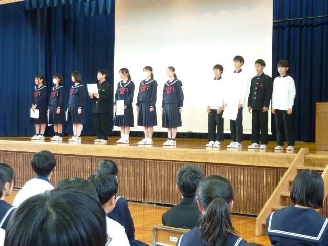 今日の6限目に全校集会を行いました。最初に以下の生徒から表彰披露がありました。