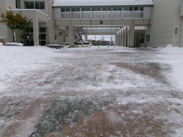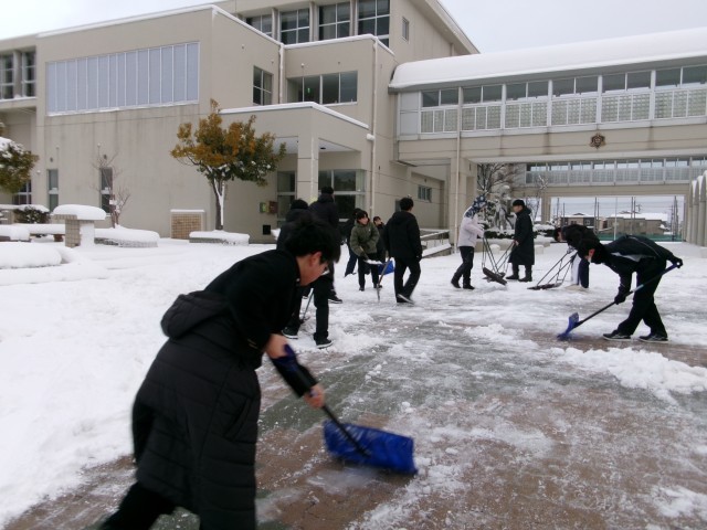 今日は、昨日からの降雪により、校舎の周りは真っ白になりました。今朝は、3年1組の生徒と早く登校した生徒が寒い中、きれいに除雪をしてくれました。ありがとうございました。